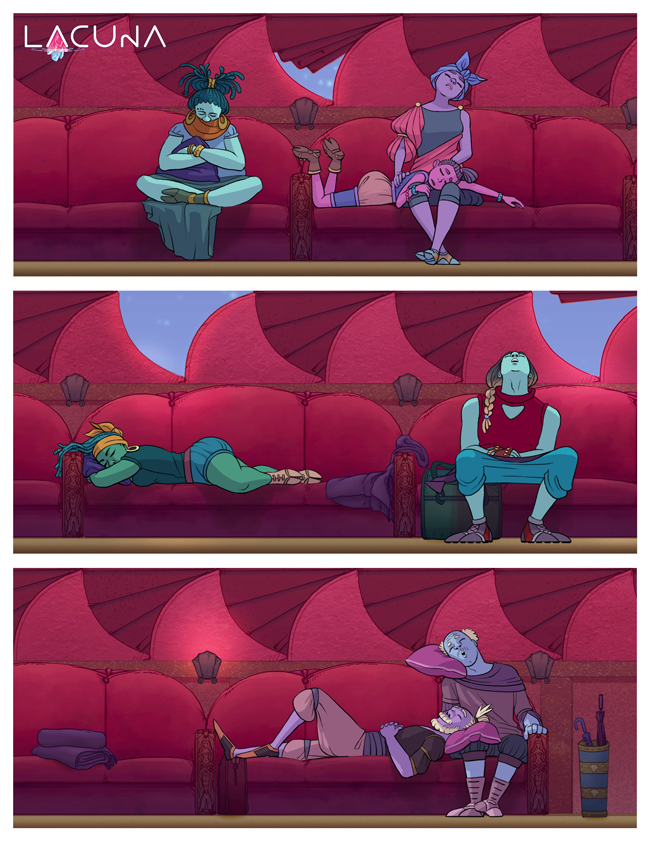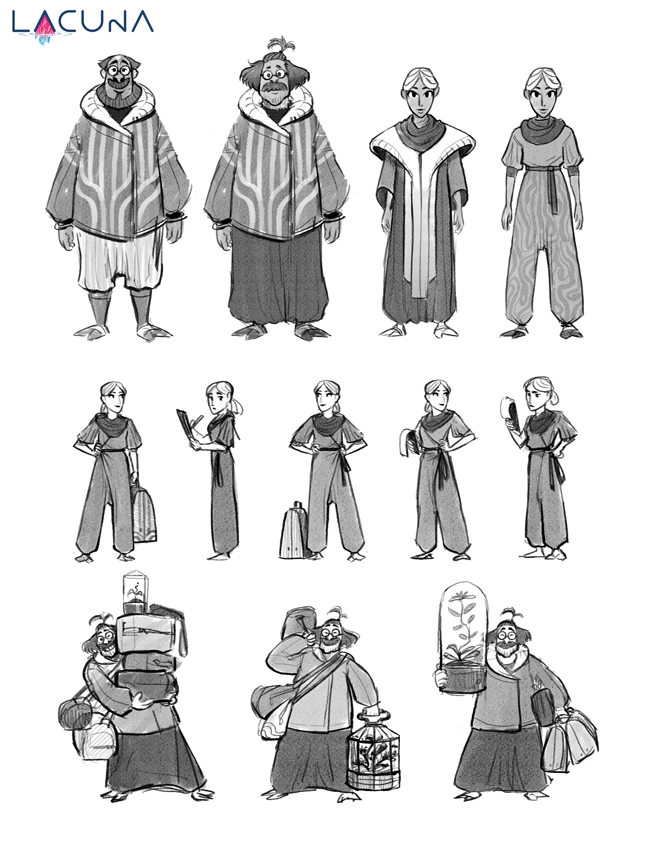 Meet Haro! An energetic, curious, and often mischievous young woman. Haro’s story begins on a train, traveling with her loving parents Erti (left), and Tsurra (right).